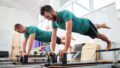 の指示のもとで、 セラピスト達にピラティスを教えています。